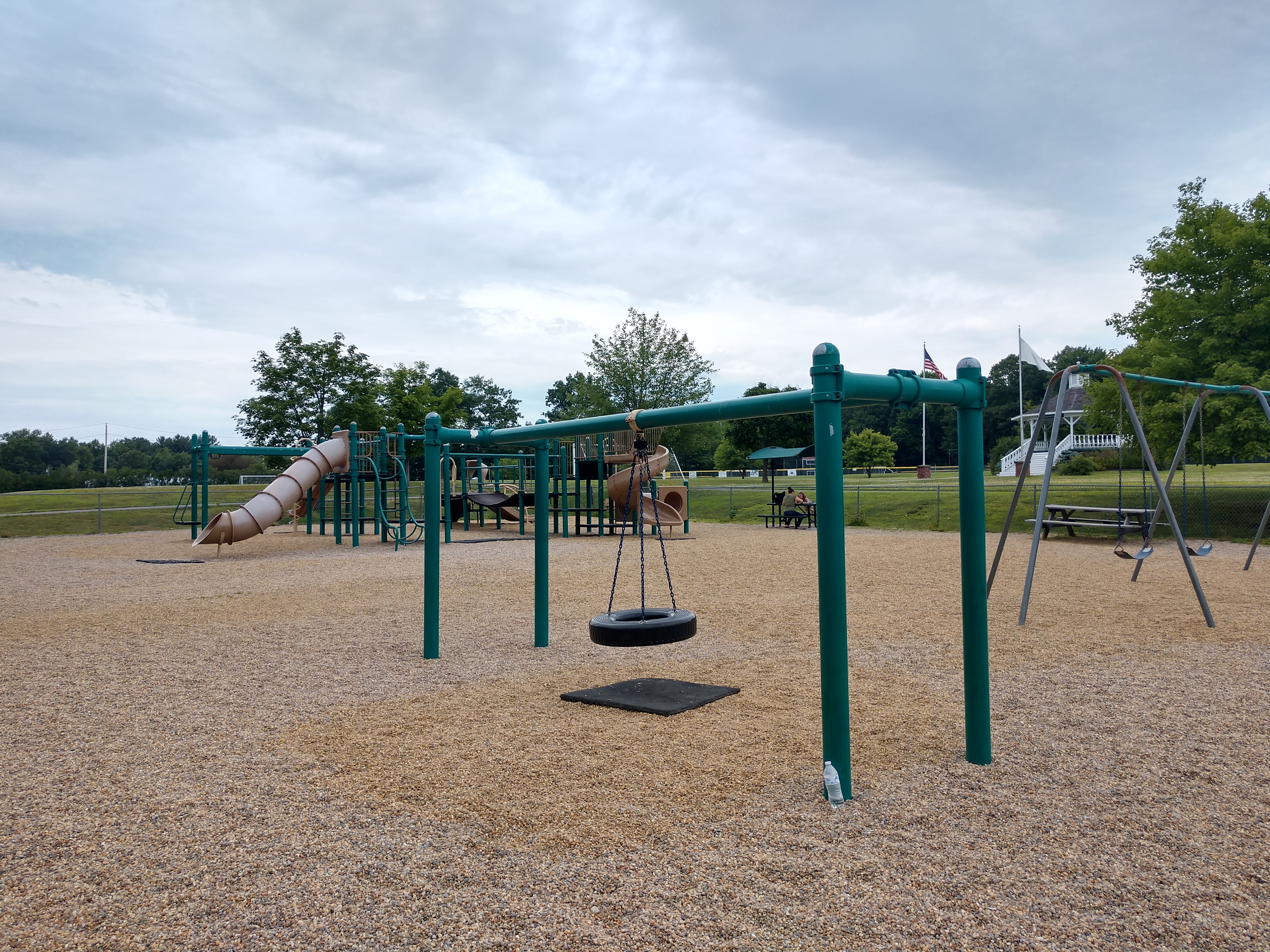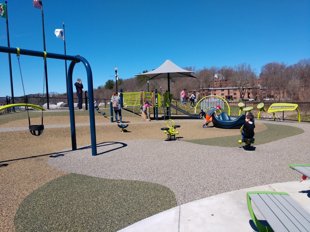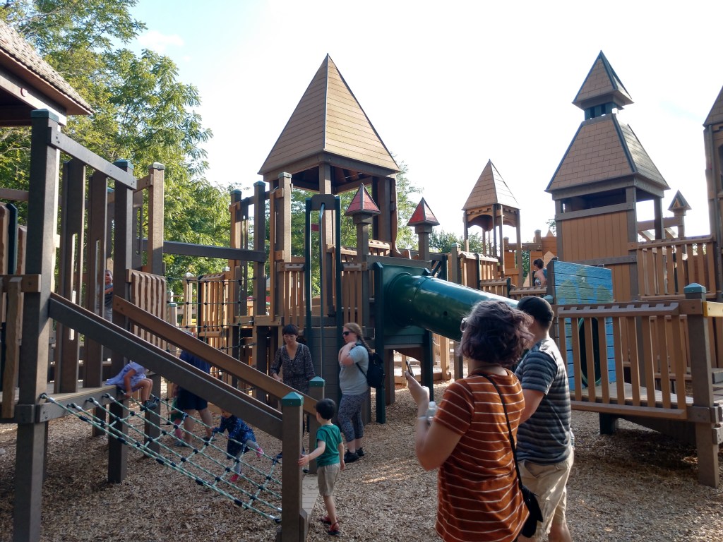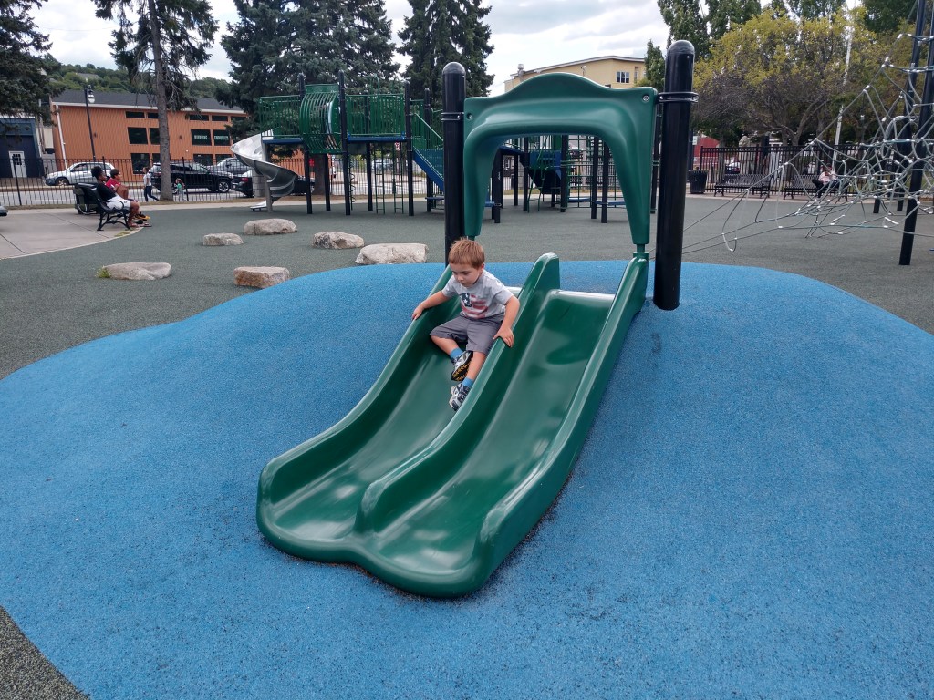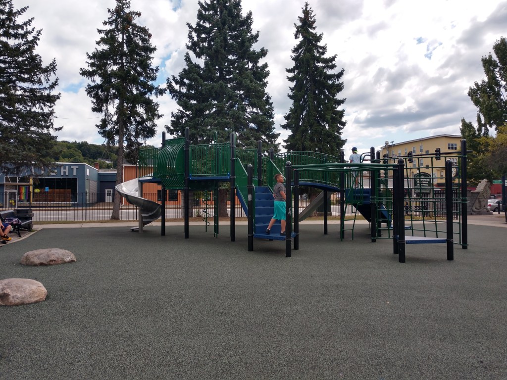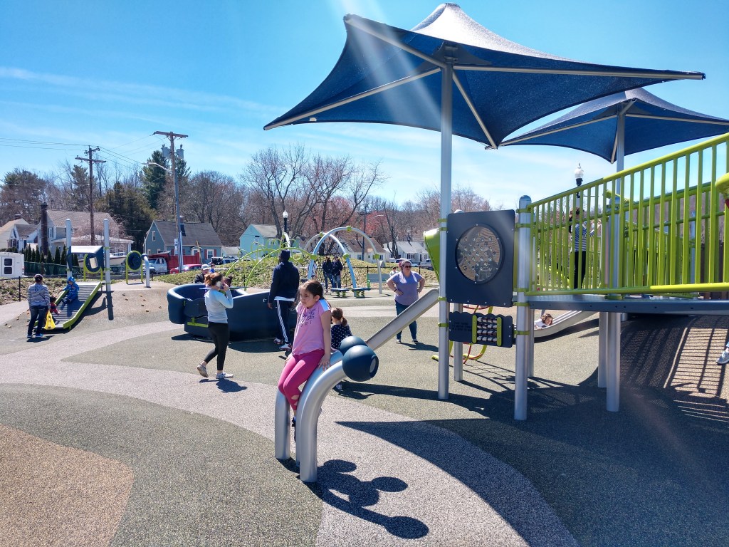 Has separate big kid and toddler sections. Seasonal splash pad with bathrooms.